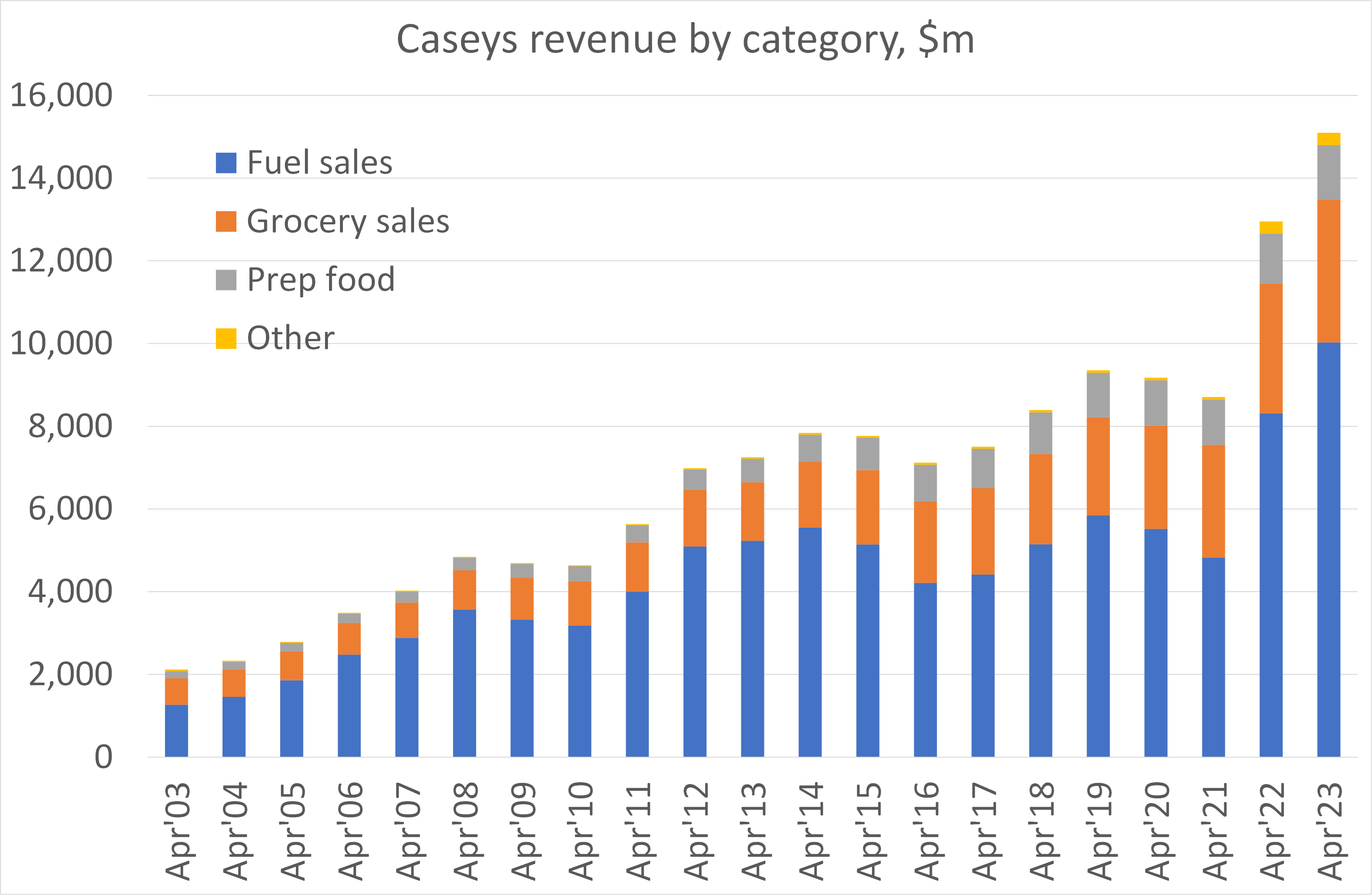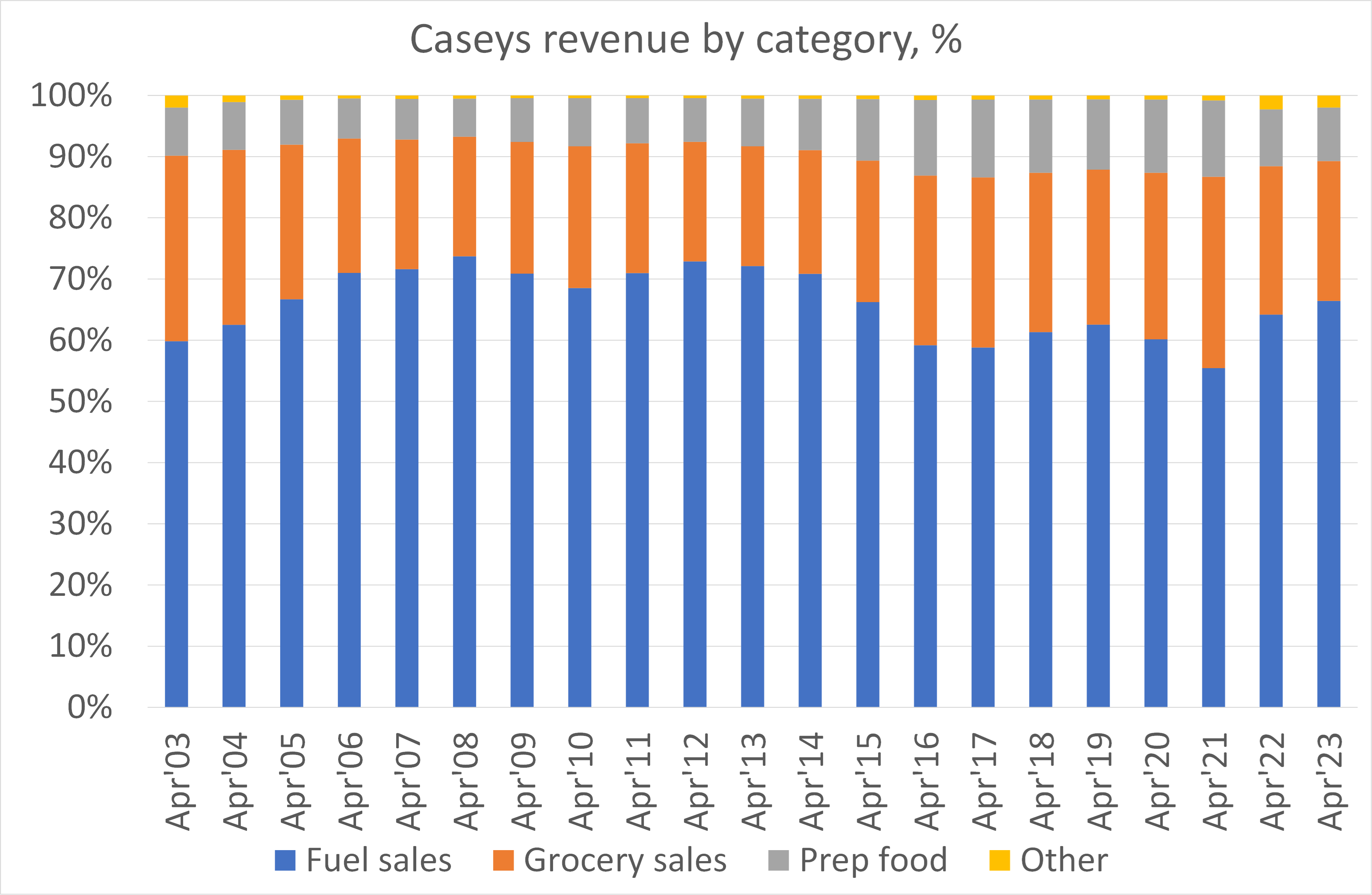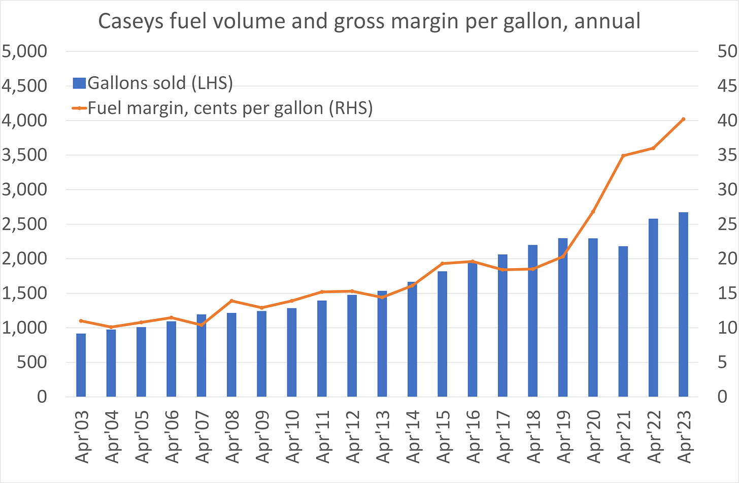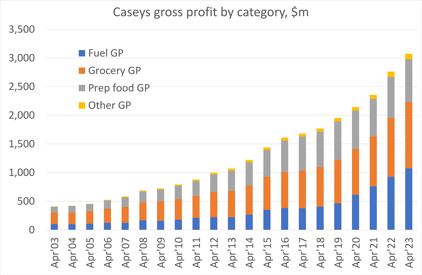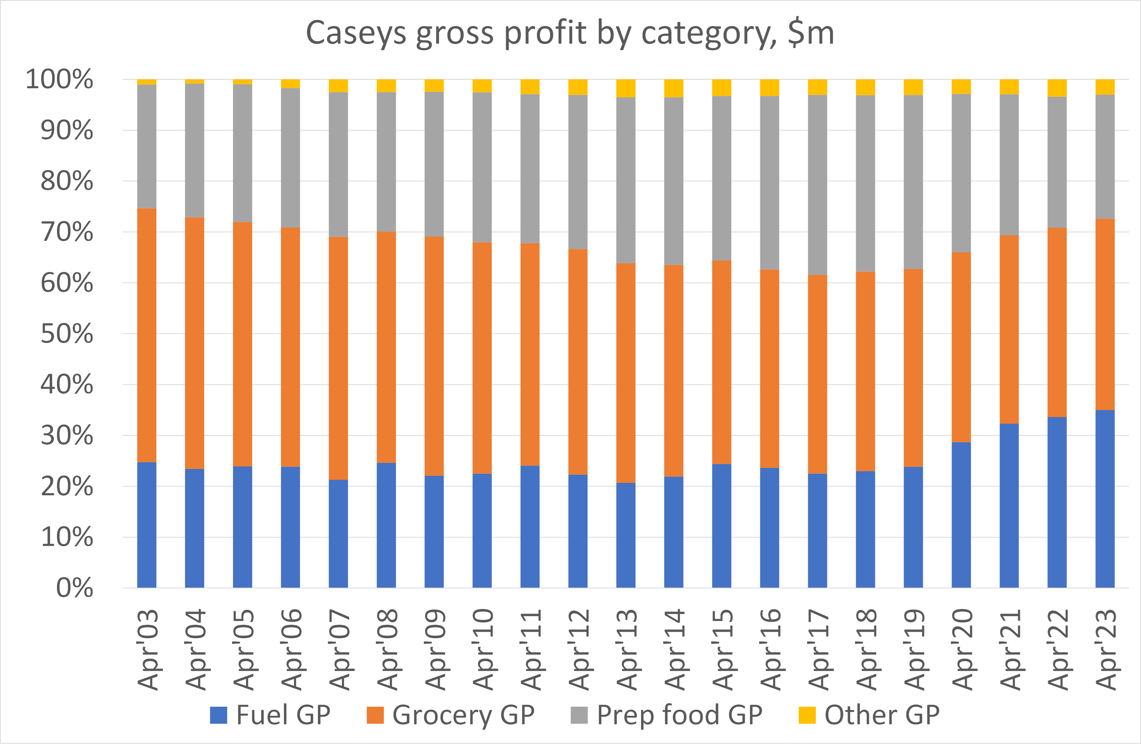 Gross margin varies hugely by category. In FY23 fuel had an 11% GPM, grocery 34% and prepared food 57%. This means that gross profit is evenly balanced across the three main categories, with roughly a third each from fuel, grocery and prepared food.