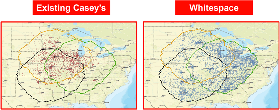 Casey’s has a self-distribution model, with three distribution centres and a fleet of 400 tractors for grocery and fuel distribution. The original distribution centre in Ankeny, Iowa is complemented by DCs in Terre Haute, Indiana (Feb’16) and in Joplin, Missouri (Apr’21). These increased Casey’s geographic reach, given management’s strategy to open stores within 500 truck miles of a distribution centre. The maps below show the existing stores and the potential catchment areas.