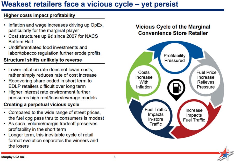 Murphy USA summarises the argument aggressively in the slide below (from its Mar’23 deck). As weak retailers hike fuel prices in despair, they lose some volume in response. This implies continued market share gains for the advantaged major players.