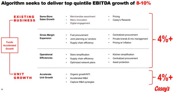 Casey’s currently trades at c.22x P/E. The growth algorithm can potentially deliver 8-10% earnings growth indefinitely (see Casey’s slide). This would make the stock a solid long-term performer if delivered.