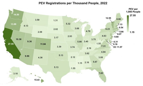 · How will the transition to electric vehicles impact Casey’s gasoline sales? Slowly. The map below shows that Casey’s states have far lower EV adoption than the coastal states, likely due to lower average incomes and higher distances driven. Casey’s has begun installing EV chargers in certain locations, but there is no hurry in this regard.