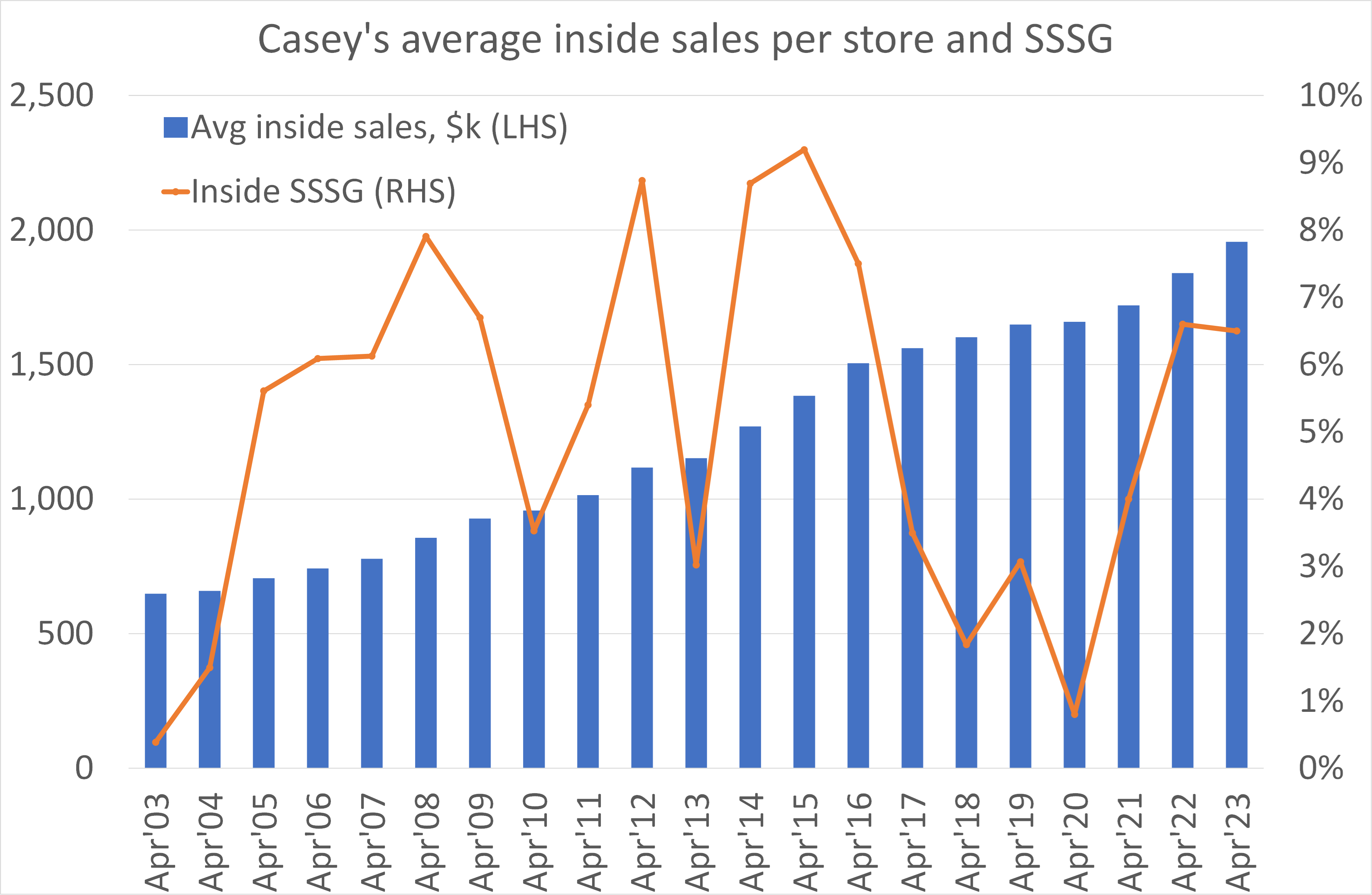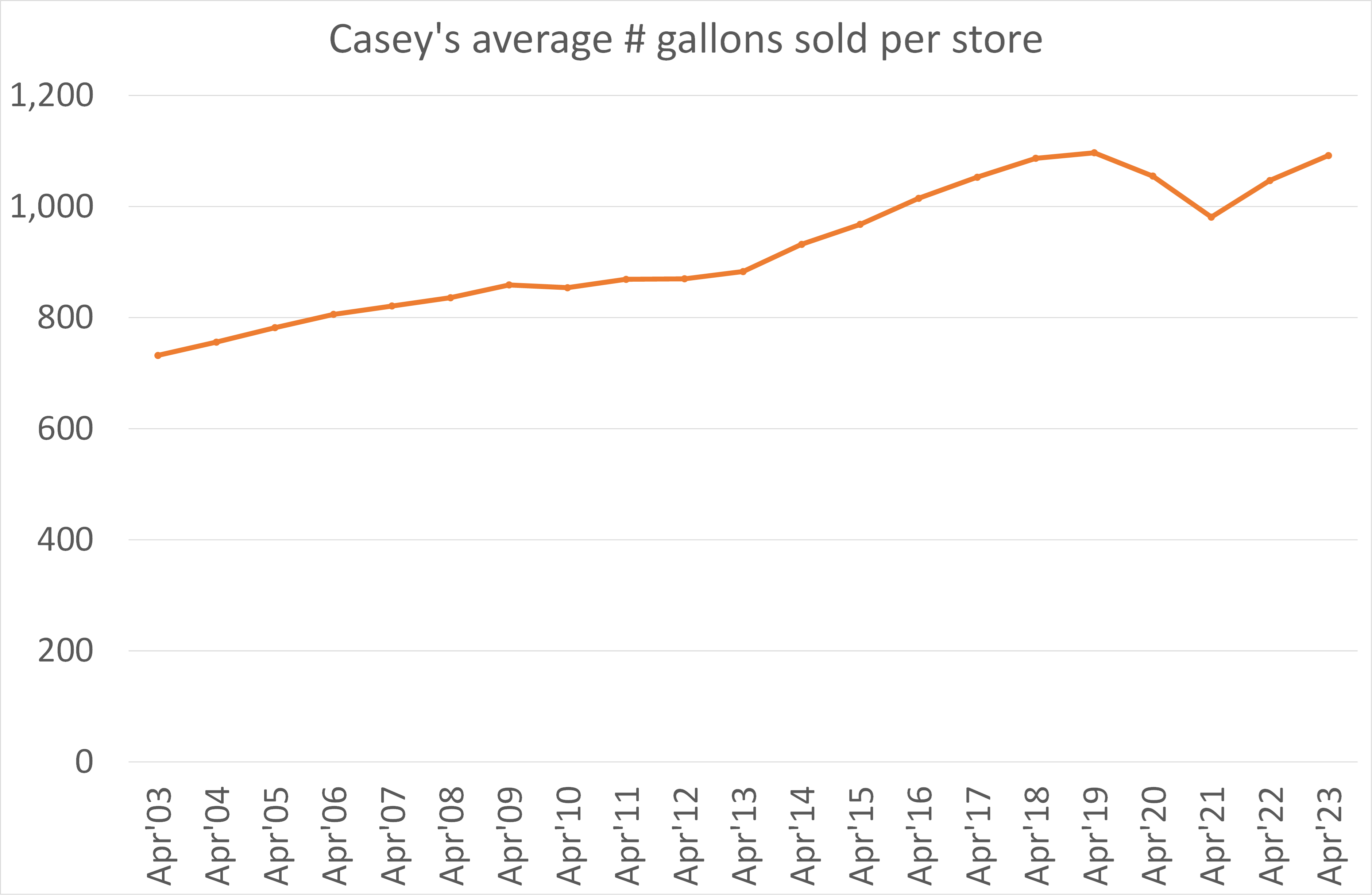 Casey’s has also increased its fuel sales per store over the period, albeit with a lull in the early 2010s and a fall during the pandemic.