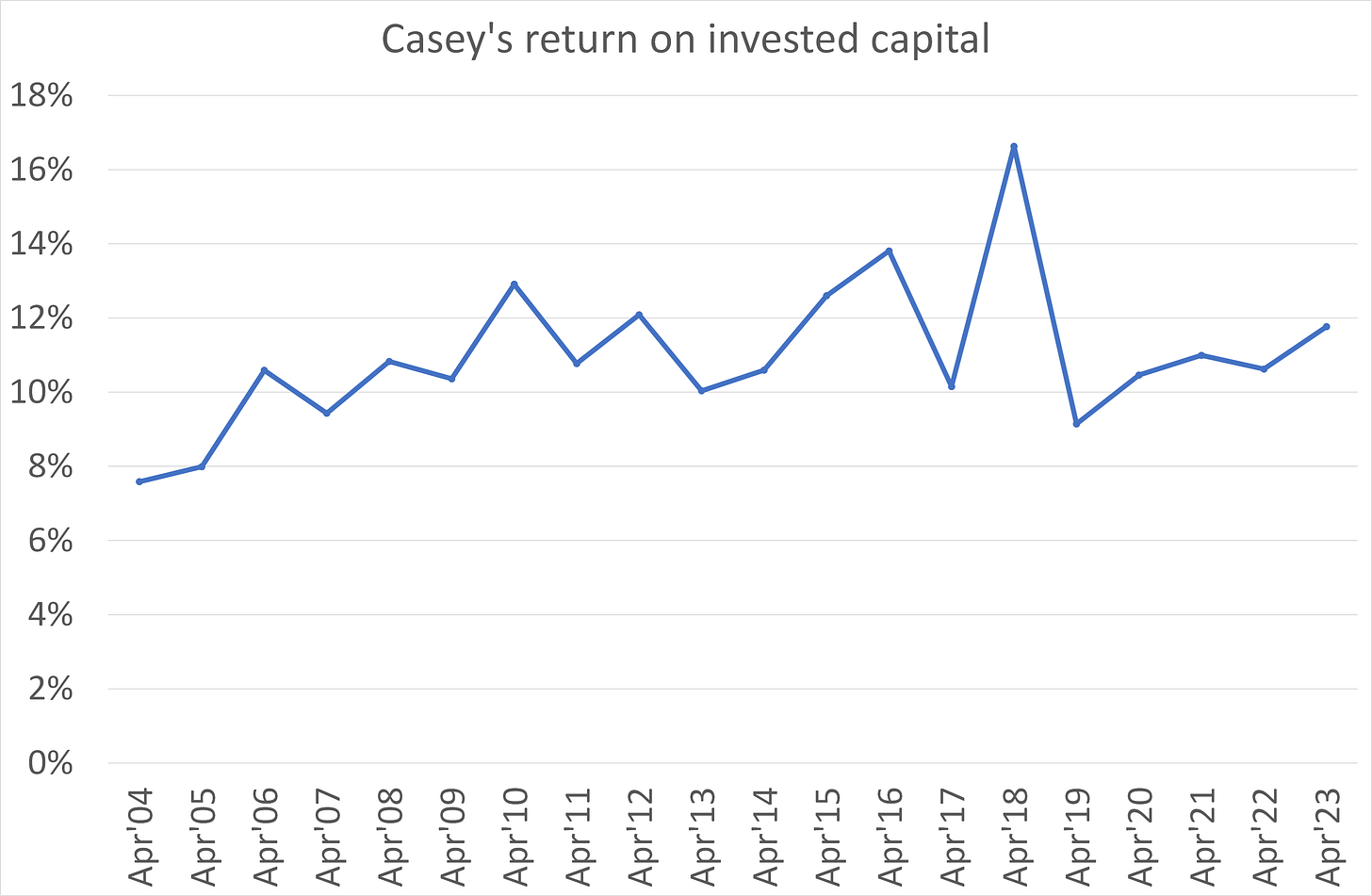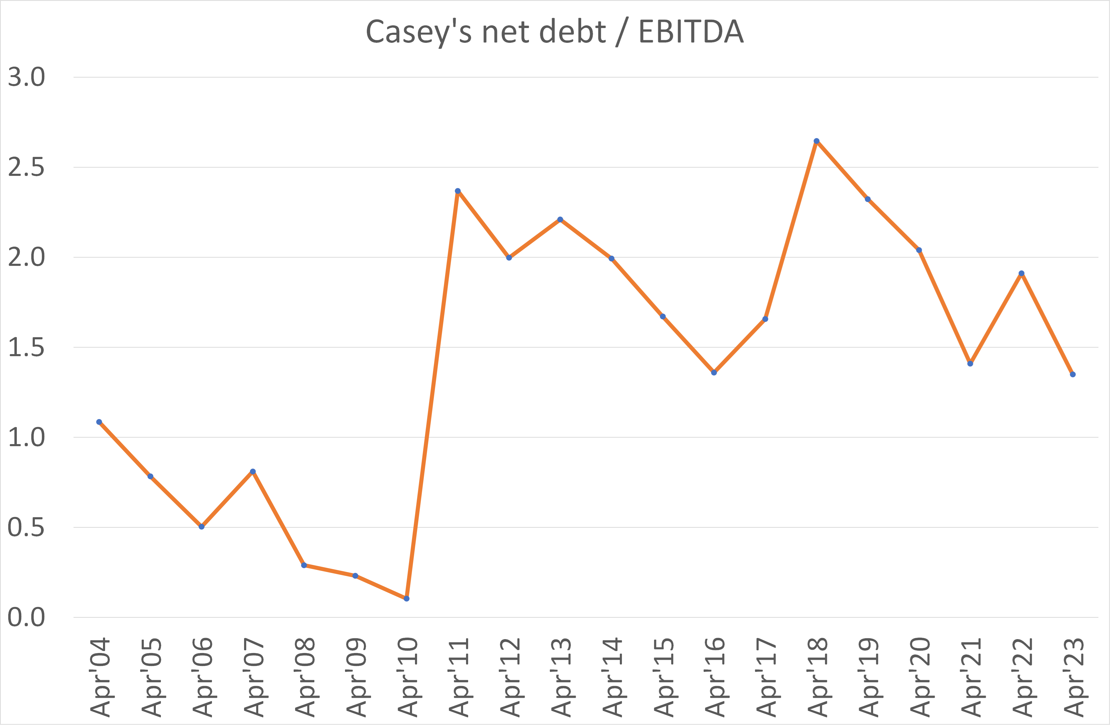 In balance sheet terms, Casey’s targets gearing of 2x debt to EBITDA at steady state. As per my chart, the company has stayed around this level for the last 12 years. It is willing to go higher for attractive M&A, and prepared to buy back stock if leverage remains far below 2x. (Buybacks will total $100m in FY24.)