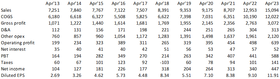 Cue Casey’s General Stores. At the time of writing it ranks #785 of US stocks with a $10.6bn market cap. Since its IPO in 1983 the company has spent 40 years compounding sales and profits at double-digit rates (see below), sustaining a high level of reinvestment at satisfactory returns on invested capital. I came across it only recently when screening for quality US names.