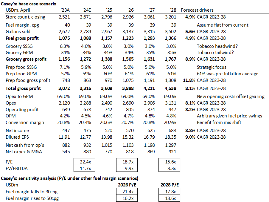 Other assumptions feel conservative or achievable against Casey’s outstanding track record of delivery, such as 3% same-store grocery sales, no uplift in inside gross margins, and no scale benefit factored into the operating expense ratio.