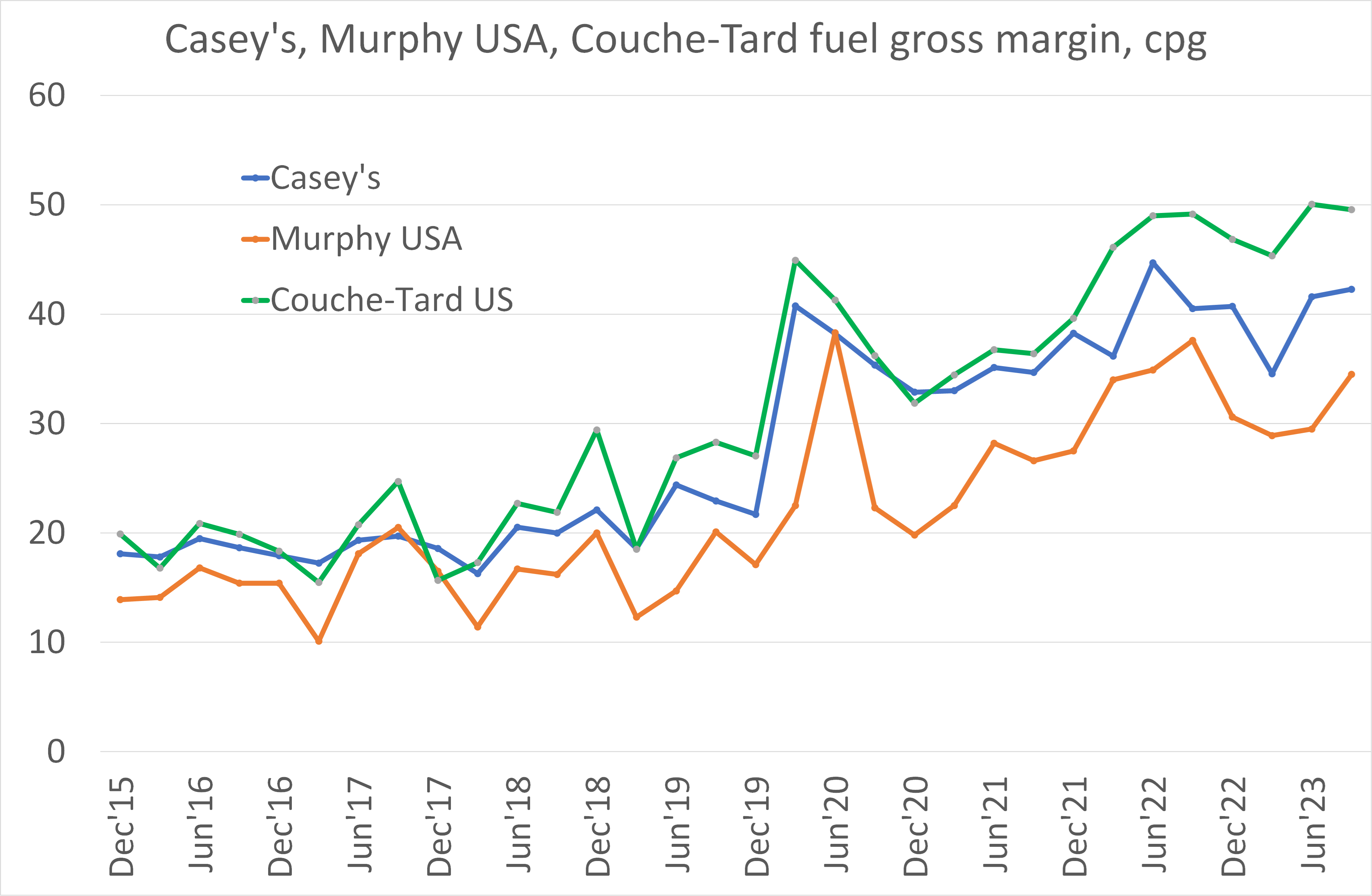 Key listed peers Murphy USA and Couche-Tard have reported similar jumps in fuel margins: see chart below. An industry-wide dynamic is clearly at work.