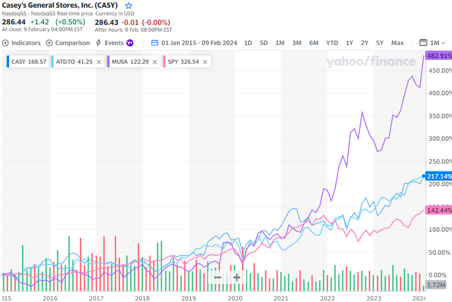 · ATD (Alimentation Couche-Tard) is perhaps closest in strategy and financial profile to Casey’s, albeit it is massive and global in scale. Both ATD and CASY have traded similarly for over a decade as regards both fundamental growth and stock price rating and performance.