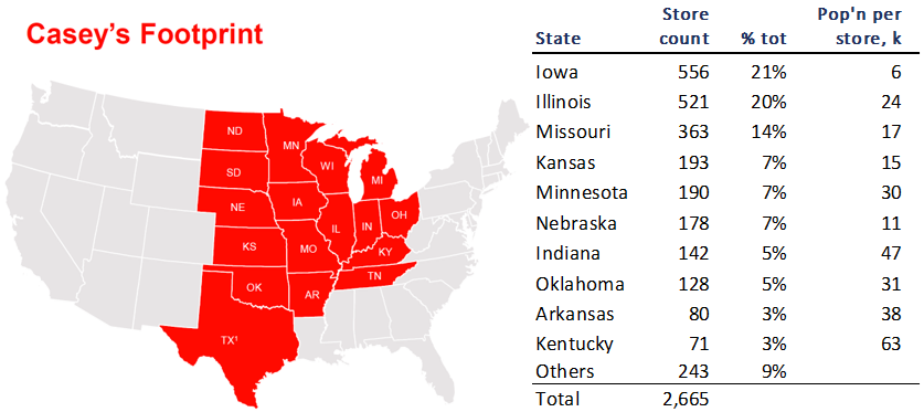 Casey’s sells gasoline, groceries and prepared foods. Its store network majors on small towns and rural locations in Iowa, Illinois, Missouri and neighbouring flyover states. Famous for clean bathrooms and fresh pizza, the stores feature some 3,000 square feet of sales area plus a kitchen, allowing for a broader and more attractive offer than independents can manage.