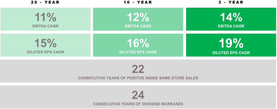 This like-for-like growth shows Casey’s advantaged format is steadily winning market share. Convenience industry growth has been closer to flat over the decades.